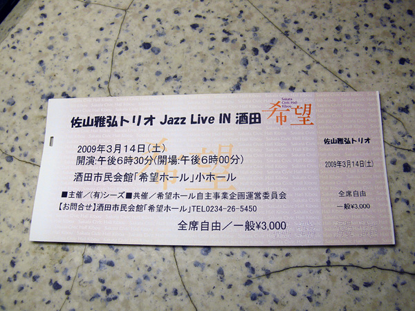 来月の希望ホールでの、佐山さんのライブのチケットです。発売当日にほとんど完売状態だったのですが、なんとか手に入りました。今月もライブに行ける予定だったのですが、インフルエンザのために何も出来ず。