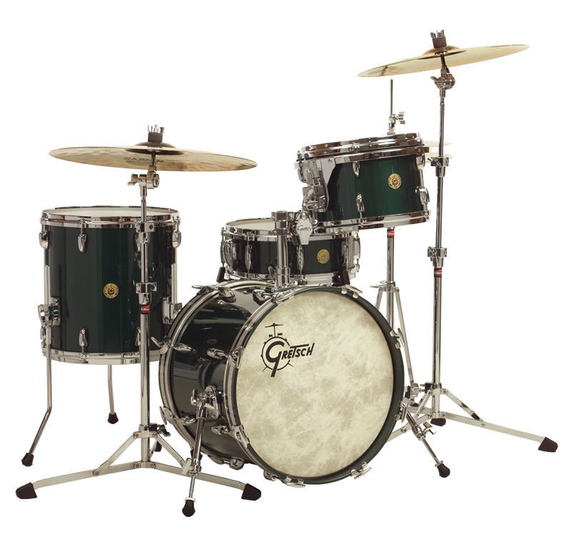 Traditional jazz sizes, mounted 12” tom, Gretsch Round Badge, Cadillac Green finish and bass drum finished with gold sparkle inlay and vintage T-rods. . Sizes: 14 x 20 bass drum, 8 x 12 tom, 14 x 14 floor tom and 4.5 x 14 8-lug snare drum. Retail - $6,145.00