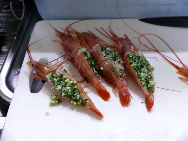 昨日、スーパーで購入したブラックタイガーだと思いますが、中に何やら詰めて、オーブンで焼くようです。