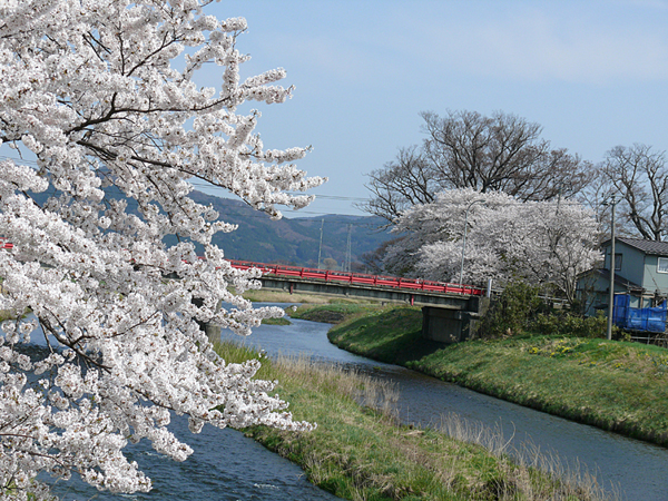 ここは、月光川の桜です。奥に見える赤い橋は、よく小学生の時に自転車をこいで友達の所に遊びに行った思い出の橋です。今もこうして健在なのはうれしいことですね。