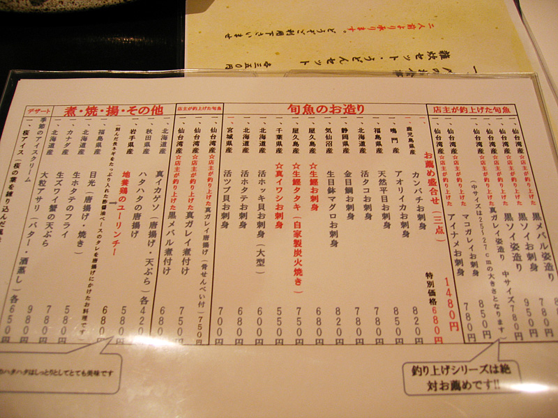 まずは、美味しいもの紹介から。今回行った店は一日目は名前は忘れてしまったのと写真を撮れなかったこともありますが、二日目に行った店が、「魚鶏屋」というところ。ちょうど仙台の一番町通りの東映ビルの中にあります。店主が釣ってきた魚を出していうので、迷わず足を運びました。