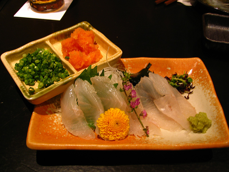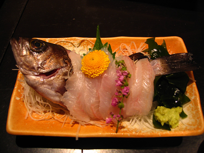 この上のメニューは毎日変わるらしいです。それはそれですごい・・・。いったいいつ寝ているんでしょうね~。毎日釣りに行ってお客出せるほどの釣果があるのでしょうか・・・。そのあたりはかなり疑問でしたが、魚はなるほど納得できる味でした。オーダーしたのは、アイナメの刺身と、黒メバルの姿づくり、そして生鰹の刺身です。