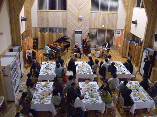 今年もお呼びいただき、楽しく演奏させていただきました。外は、ものすごい天候になっていましたが、お客さんはみんなあったかく、美味しそうにボジョレヌーボーをワイングラスで。このイベントは今年で3年目を迎えます。河野さんとは、このライブの時にしか会えないのですが、あいかわらずリハーサルもなしで、ぶっつけです。毎回ながら、スタンダードあり、フリースタイルあり、何が出てくるか分からないびっくり箱みたいな河野さんの演奏にみなさん大満足されていました。外の寒さとはうってかわって、開場は熱気でむんむん状態です。