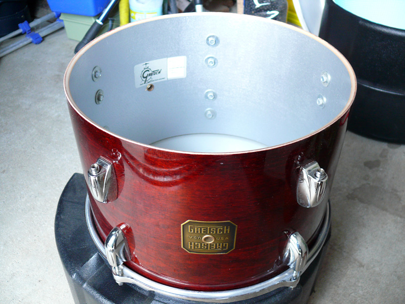 個人的には、とても好きなヘッドなのです。スネアではすでに使っているので、タムに使ったらどうかというある意味実験?ですね。 ヘッドを外すと、タムの中はこんな感じです。インナーは、GRETSCHの伝統でシルバーに塗られています。この用にシルバーにインナーを縫ったのは60年代ころではなかったかと思うのですが・・・。私が持っている50年代のスネアには、シルバー塗装が施されていませんから。その当時、YAMAHAあたりでも、インナーを縫っていたようですから、いかに影響力が大きかったメーカーかが分かります。